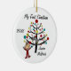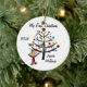Un joli ornement de Noël en céramique ronde avec un personnage en bâton dans un dortoir rouge devant l'arbre de Noël décoré dans lequel le chat est installé, et des zones où vous pouvez ajouter du texte y compris l'année en cours et le nom de l'enfant. C'est un cadeau adorable pour toute petite fille qui fête son premier Noël !
