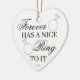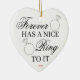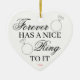 Ce magnifique ornement est orné du dicton "Forever a une belle bague à elle". Le dicton est décoré d'anneaux autour pour la célébration fiançailles ou mariage ! L'année peut être customisée sur le front. Au verso, customisez les noms du couple et la date exacte du fiançailles ou du mariage ! L'ornement est beau pour se souvenir de cette étape spéciale dans une relation et sera chéri pour les années à venir! Customisez aussi la couleur du dos si vous le désirez !