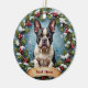 A beautiful, ultra-detailed Christmas ornament design featuring a realistic portrait of the breed centered within a soft, festive winter frame. This elegant design includes pine branches, red berries, and snowflakes against a snowy backdrop, illuminated by warm holiday lighting. The balanced, round composition includes clear space below the dog for customization.