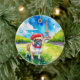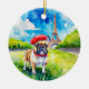 Cet ornement de Noël personnalisable présente un portrait aquarelle d'un Bulldog français portant un béret devant la Tour Eiffel à Paris.
