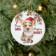 Sur le devant de cet ornement de vacances est l'image d'un mignon chiot Corgi portant un casquette de Père Noël rouge et blanc. Il est assis avec un ornement d'arbre cassé devant lui. Le texte en rouge dit "Cher PÈRE NOËL, définissez-vous NAUGHTY". Au verso, le texte rouge et vert indique MERRY CHRISTMAS", et il y a des champs de texte supplémentaires pour vous permettre de customiser à ce que vous voulez.