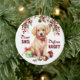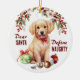 Sur le devant de cet ornement de vacances est l'image d'un mignon chiot Golden Retriever portant un col arc rouge. Il est assis avec un ornement d'arbre cassé devant lui. Le texte en rouge dit "Cher PÈRE NOËL, définissez-vous NAUGHTY". Au verso, le texte rouge et vert indique MERRY CHRISTMAS", et il y a des champs de texte supplémentaires pour vous permettre de customiser à ce que vous voulez.