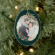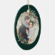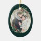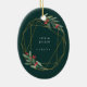 L'élégante décoration de Noël est ornée d'une photo préférée entourée d'un cadre géométrique ovale de feuille d'or imitant le feuillage vert aquarelle et les baies rouges. Ajoutez vos noms et l'année, ou un message personnalisé, à l'envers dans un cadre géométrique délicat assorti.