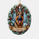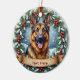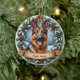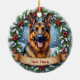 A beautiful, ultra-detailed Christmas ornament design featuring a realistic portrait of the breed centered within a soft, festive winter frame. This elegant design includes pine branches, red berries, and snowflakes against a snowy backdrop, illuminated by warm holiday lighting. The balanced, round composition includes clear space below the dog for customization.