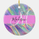 Nom monogramme irisé holographique de l'arc-en-ciel et ornement céramique initial. Votre nom personnalisé et votre monogramme sont écrits dans un élégant script écrit à la main avec un arrière - plan rose. Un cadeau d'anniversaire ou de Noël parfait !