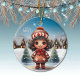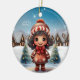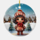 Girly Character stocking stuffer for female Ceramic Ornament featuring a unique Gingerbread Girl, winter wonderland scene of Christmas trees and white snowy village houses with xmas lights, in the background, capturing the magic and joy of the season. The words "Let it Snow" shine bright in the snowy sky. Whimsical female graphic illustration decor with wintry landscape. Cute present perfect for gifting friends, family, or coworkers.
