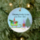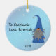 Ce joli ornement a un gnome de Père Noël en rouge, assis dans un traîneau rempli de cadeaux et d'un sapin de Noël. A côté du traîneau, un gnome habillé d'un manteau violet coordonné et casquette qui skie. Un sapin de Noël avec une étoile en haut est derrière lui. L'Arrière - plan est bleu avec des flocons de neige qui scintillent et tombent sur le sol couvert de neige. Ci-dessus il dit "Gnomebody vous aime comme moi !" L'envers a un gnome habillé en bleu contre l'arrière - plan de flocon bleu. Il y a un endroit pour le personnaliser pour le rendre spécial.