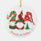 Joli ornement de Noël de style nordique personnalisé. L'un des côtés présente trois gnomes de style scandinave avec des casquettes et des tuniques rouges et verts saisonniers et "Gnome for the Holidays" en écriture rouge stylisée (vous pouvez customiser ce texte). Au contraire, un autre gnome se tient à côté des noms de votre famille, et en dessous vous pouvez ajouter l'année.