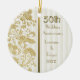 Magnifique doré et blanc cinquantième Mariage Anniversaire gardiennage ornement avec subtil blanc arrière - plan à bande verticale sur l'avant et élégant, détail or floral panneau côté dentelle. Le dos de l'ornement a assorti le motif de dentelle d'or sur le blanc. Customisez le prénom et le texte de la date avec vos informations.