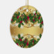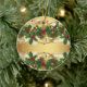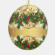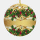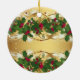 This ornament features a beautiful holiday garland made of lush green holly leaves, bright red berries, sparkling gold accents, and delicate white snowflakes. Flowing golden ribbons weave through the design, adding movement and a warm festive glow. The rich color palette of gold, green, and red gives the ornament a classic Christmas feel while still looking elegant and refined.