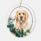 A l'avant de cette fête est un beau portrait d'un chien de Golden Retriever qui regarde à travers une toupie à feuillage persistant et sainte. Les baies rouges et les cônes de pin ornent les sprigs de houx et de pin. L'image est placée sur un cercle blanc à l'intérieur d'un cercle mince de ligne rouge. L'arrière de l'ornement a la même couronne à feuillage persistant et rond avec votre texte personnalisé en rouge.
