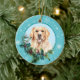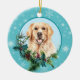 A l'avant de cette fête est un beau portrait d'un chien de Golden Retriever qui regarde à travers une toupie à feuillage persistant et sainte. Les baies rouges et les cônes de pin ornent les sprigs de houx et de pin. L'image est placée sur un cercle bleu pâle encadré par un motif de flocon bleu rétro. Le dos de l'ornement a le même arrière - plan et cercle avec votre texte personnalisé en bleu.