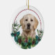 Sur le devant de cet ornement de vacances est l'image d'un Chien d'or Retriever qui regarde à partir d'une toux sainte et à feuillage persistant. Les baies rouges et les cônes de pin ornent les sprigs de houx et de pin. L'image est placée sur un cercle blanc à l'intérieur d'un cercle mince de ligne rouge. L'arrière de l'ornement a la même couronne à feuillage persistant et rond avec votre texte personnalisé en rouge.