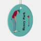 Turquoise golfeur personnalisé, portant un casquette, chemise rouge profonde et pantalon bleu, mettant une balle de golf dans un ornement de Noël.