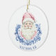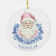 Cet ornement de Noël a un visage Père Noël avec une couronne damassée bleue. Vous pouvez personnaliser avec un nom.