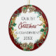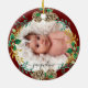 "Grandparents First Christmas Holly Pine Cone Photo Ceramic Ornament." Elegant holly and pine cone and foliage wreath was painted in watercolor by internationally renowned and licensed artist, Audrey Jeanne Roberts, copyright. The reverse side has an easy to change template for your photograph and your grandchild's name.