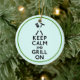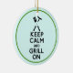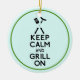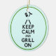 Ornement en céramique ronde avec une image, de part et d'autre, de l'expression "Gardez le calme et le grill allumé" en lettres noires en gras surmontées d'ustensiles de barbecue et d'un hot dog sur aqua. Bordure verte. Voir l’ensemble de la collection d’ornement de la Fête du Père dans les TOUCHES SPÉCIALES | Section Favoris.