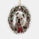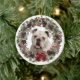 A l'avant de cet ornement de vacances se trouve l'image d'un Bulldog blanc encadré d'une jolie couronne de pin aquarelle et d'une couronne de fruits Holiday. L'image du chien est au centre sur un arrière - plan blanc. Un arc rouge brillant donne un peu d'éclat de Noël à la couronne. Le dos de l'ornement a la même couronne avec votre texte personnalisé en rouge et vert foncé.