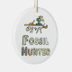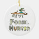 Le graphique Fossil Hunter montre un collectionneur passionné examinant une partie d'un fossile avec les restes encore enfouis sous terre. Ci-dessous se trouvent les mots "Fossil Hunter" avec les lettres parfois cassées comme un fossile pourrait être. Un design amusant pour les amateurs de chasse aux fossiles.