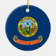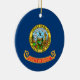 Le Flag of the state of the Idaho consis ts of the state seal on a field of blue. "État de l'Idaho" appear in gold letters on a red and gold band below the seal. according to the official description of the flag, there should be a fringe of gold around the edges, but a long time the versions of the flag not shown until they remodeled the flag after. The seal, in the center of the flag, depicts a miner and a woman representing equality, liberty and justice. The symbos on the seal represent some of Idaho’s natural resources: mines, forests, farmland, and wildlife.