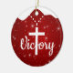 Inspirational Victory Cross Christian Decor Ceramic Ornament, perfect for the Christmas season or as a thoughtful Xmas gift. The front features the white cursive word "Victory" where a large Cross on a beaded necklace replaces the letter T, set against a berry red background with a light sparkle that mimics a gentle winter snowfall, complete with a snow-capped effect. On the back, the same background showcases the sacred writing from the Bible verse John 3:16: "For God so loved the world, that he gave his only begotten Son, that whosoever believeth in him should not perish, but have everlasting life," rendered in white customizable text for a personal touch. This religious hanging decoration embodies faith, holy spirit, and uplifting worship, drawing from Christ teachings and divine passages in the testaments. As a devotional keepsake or present marker, it's ideal for expressing doctrine and the word of our Lord during the winter season. Make it your own with editable, personalizable elements to create a custom sacred memento that's both inspiring and festive. Plus, transfer this versatile sacred motif to your choice of many products on Zazzle, from mugs to apparel, for endless inspirational options. Personalize today and bring a touch of divine joy to your holiday tree or home!