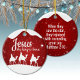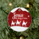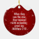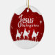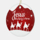 Jesus the King is Born, Religious Holiday Ceramic Ornament with berry red sparkle glistening glow, three wise men on camels following the North Star capturing the Christmas magic and joy of a Christian season. On the back, the sacred writing, Luke 2:12 states, "And this shall be a sign unto you; Ye shall find the babe wrapped in swaddling clothes, lying in a manger" all in customizable text, ready for you create your favorite bible verse in festive devotional design hanging decorations. Order your Christ teachings testaments today and make your custom inspirational doctrine keepsakes extra special with divine passages of the word of our Lord! 🎄⛪️