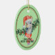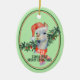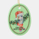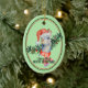 Une aquarelle d'un adorable lama blanc est la caractéristique des deux côtés de ce joli ornement de vacances. Le lama porte un chapeau de Père Noël rouge et blanc et une écharpe. Derrière lui se trouve une épée de sainte aux baies rouges. Le texte en bas dit "Llama Mia ! JOYEZ NOËL". L'image et le texte sont placés sur un arrière - plan vert pâle.