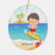 Personnalisez le garçon de surfer mignon daté Noël Ornement mis sur un arrière - plan de plage. Visitez notre boutique pour voir cette adorable surfeuse dans une variété de cheveux.
