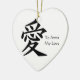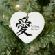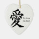 Le cadeau parfait pour la Saint-Valentin, Noël, Nouvel An chinois, ou un anniversaire, notre ornement en forme de coeur présente la calligraphie kanji pour "amour". Ajoutez également votre propre texte avant ou arrière.