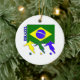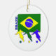 Jeu de trois footballeurs devant le drapeau brésilien. Le nom du pays Brésil est du côté