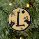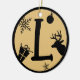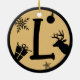 Thème de Noël, lettre monogramme L, en noir sur un arrière - plan d'or. Le noir et l'or peuvent être modifiés en cliquant sur le lien "customiser plus loin". Lettre mignonne L avec flocons de neige, bauble, tête de cerf, et cadeau enveloppé.