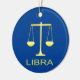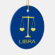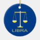 Cet ornement impressionnant présente une image art numérique d'une paire d'écailles de pesée de couleur dorée avec le mot Libra sous le texte en or. Un design amusant pour les gens célébrant un anniversaire né entre le 23 septembre et le 22 octobre sous le signe étoilé de Libra. Il y a du texte personnalisé à l'arrière pour que vous puissiez inclure un nom ou un message.