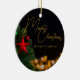 Ces magnifiques ornements de Noël Joyeux sont ornés d'écriture manuscrite dorée moderne sur des lumières scintillantes à côté d'un arbre de Noël festif décoré d'ornements rouges et verts. Customisez cet élégant cadeau de fête avec un script personnalisé sur le ciel noir de la nuit.