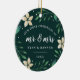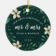 Célébrez votre premier Noël en couple marié avec cet ornement charmant et festif. Le design présente "notre premier Noël en tant que Monsieur. et l'année en lettres blanches, entourée de fleurs de poinsettia en ivoire et de feuillage vert de vacances sur un arrière - plan vert chasseur. Ajoutez une photo à l'arrière avec des ornements botaniques de vacances assortis. Conçu pour coordonner avec notre collection de vacances Bright Boughs.