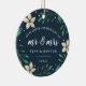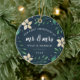 Célébrez votre premier Noël en couple marié avec cet ornement charmant et festif. Le design présente "notre premier Noël en tant que Monsieur. & Mrs" et l'année en lettres blanches, entourée de fleurs de poinsettia en ivoire et de feuillage vert de vacances sur un riche arrière - plan bleu marine. Ajoutez une photo à l'arrière avec des ornements botaniques de vacances assortis. Conçu pour coordonner avec notre collection de vacances Bright Boughs.