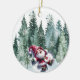 Adorable Christmas ornament has a super sweet Gnome dressed as Santa, making gnome angels in the snow. He's surrounded by a snowy forest and snowflakes. The reverse side has a pattern of red bows with Christmas pine and red berries tied to them.