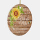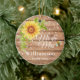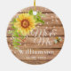 Un ornement en céramique de mariage élégant et rustique au tournesol jaune comprenant un fond en grain de bois brun décoré d'un joli tournesol jaune aquarelle floral avec une abeille et une guirlande de lumières. Fait une annonce unique de sauvegarde de la date, un remplisseur de bas, un cadeau personnalisé de douche de mariée, un cadeau de fiançailles ou un cadeau de mariage souvenir. Personnalisez-le avec le nom de famille des mariés et la date de la cérémonie de mariage.