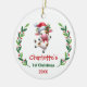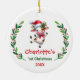 Célébrez un précieux événement avec cet Ornement en Céramique Personnalisé pour le Premier Noël de Bébé, représentant une adorable petite vache portant un chapeau de Père Noël festif, entourée de délicats feuillages hivernaux verts et rouges. Ce design charmant est imprimé des deux côtés pour un souvenir magnifiquement fini et chaleureux. Personnalisez le nom et l'année du bébé pour créer une décoration de vacances significative que les familles chériraient pendant des années. Si vous le souhaitez, le texte peut être encore personnalisé en changeant les couleurs, les polices et le message de 1er Noël. Un cadeau de Noël parfait pour les nouveau-nés, les nourrissons, les nouveaux parents et les grands-parents. Cet ornement mignon et moderne mélange des couleurs de vacances intemporelles avec un adorable animal bébé illustré, ce qui en fait un ajout charmant à tout arbre de