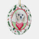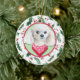 Sur le devant de cet ornement de vacances est un beau portrait aquarelle d'une miniature blanche aux yeux brillants Poodle portant une écharpe rouge. Le portrait est placé dans un cadre circulaire en motif de baies rouges et feuilles vertes. Le dos de l'ornement a le même arrière - plan et cercle avec votre texte personnalisé en rouge et vert assortis.