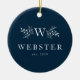 Votre initiale entourée de branches festives avec le nom et l'année ou la date du mariage en blanc contre un arrière - plan bleu marine festif (la couleur peut être modifiée en cliquant sur "personnaliser"). Avec une photo à l'arrière, cette décoration est parfaite pour le couple marié.