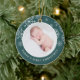 Un ornement photo élégant commémore le premier Noël de votre bébé sucré avec une photo chère de chaque côté, encadrée de flocons de neige blancs sur le vert d'épinette hivernale. Personnalisez avec une légende personnalisée de chaque côté ; avec "[nom] premier Noël" sur le devant et l'année sur le dos.