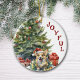 Sur le devant de cet ornement de vacances est l'image d'un mignon Pembroke Welsh Corgi Chien portant un chapeau de Père Noël rouge et blanc. Le chien est assis devant un Holiday tree décoré, et est enveloppé d'un chapelet de lumières festives. Le texte rouge sur le côté dit "JOYFUL". Au verso, le texte rouge et vert indique MERRY CHRISTMAS", et il y a des champs de texte supplémentaires pour vous de customiser. Faites-le dire ce que vous voulez !