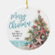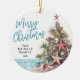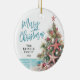 Célébrez la saison avec cet ornement de Noël festif et de plage, parfait pour une fête côtière. Un arbre de Noël fantaisiste composé de coquillages de plage, d'étoiles de mer et de corail, mêlant vert, bronzé et orange sur l'étoile de mer en haut, apporte une touche tropicale amusante à votre décor de vacances. Le fond du décor est constitué de sable doux et de douces vagues bleues turquoises de l'océan, créant une scène de rivage détendue. "Joyeux Noël" apparaît en haut dans un mélange de polices bleues et noires, en utilisant un joyeux mélange de script et de typographie serif. Votre nom de famille ou texte personnalisé s'affiche sous l'arbre, avec espace pour ajouter une année pour une touche personnelle. Le même design est imprimé sur les deux côtés, ce qui en fait un charmant gardien de tous les angles. Tout le texte, les polices et les couleurs peuvent être customisés. Un grand ajout à votre arbre sur le thème de la plage ou un cadeau réfléchi pour quiconque aime passer des vacances au temps chaud.