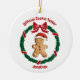 Un mignon biscuit en pain d'épice portant un chapeau de Père Noël à l'intérieur d'une couronne de Noël stylistique sous les mots "Official Cookie Taster."