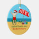 Ce joli Noël personnalisé en Juillet ornement fait un cadeau parfait pour une fête d'été pour un bain de plage ou de la piscine. Faites-en une extravagance amusante sur le thème du pôle nord avec le Père Noël dans ses maillots de bain à côté d'un parapluie de plage rayé rouge et blanc et des cadeaux. Je n'ai jamais vu M. Klaus en maillot de bain avant ! Le texte vert cravate ensemble le thème amusant de Noël.