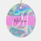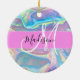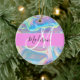 Nom monogramme irisé holographique rosé, pêche et aqua, et ornement céramique initial. Votre nom personnalisé et votre monogramme sont écrits dans un élégant script écrit à la main avec un arrière - plan rose. Un cadeau d'anniversaire ou de Noël parfait !