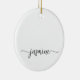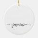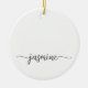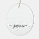 Ornement en céramique personnalisé avec un monogramme minimaliste, simple et propre, avec un nom en écriture cursive noire sur fond blanc. Ces créations présentent votre prénom dans une jolie typographie (ou calligraphie) avec un style à queue en arabesque. Celles-ci sont faciles à personnaliser. Cadeau féminin élégant pour une pendaison de crémaillère, mais aussi pour un anniversaire, la fête des mères, une fête d'anniversaire pour les 16 ans, un mariage, une fête de fiançailles, une baby shower, une fête de fin d'études et c'est pour la fille qui aime les choses uniques et élégantes.