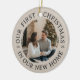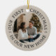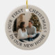 Marquer le déménagement avec un gardien douillet. Ce ornement en céramique ronde neutre présente un titre "NOTRE PREMIER NOËL" avec "DANS NOTRE NOUVELLE MAISON" ci-dessous, encadrant une fenêtre photo à pointe de brosse douce. Les chiffres de l'année fractionnée sont placés sur les côtés pour un agencement propre et équilibré. Le ton grège et le type serif classique sont assortis à n'importe quel arbre, manteau ou boîte cadeau. Laissez-vous tenter par votre instantané préféré du salon et préparez l'année pour célébrer votre nouveau départ tous les mois de décembre.