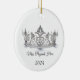 Cet ornement en céramique est présenté en forme ronde avec une tiare en cristal argenté brillante avec du texte noir sur un arrière - plan blanc. Customisez cet article et modifiez l'exemple de texte avec votre nom, date ou autre titre de concours personnel. Image sous licence