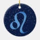Ornement dans le symbole zodiaque pour Léo en bleu argenté doux, recouvert des étoiles de la constellation, contre un ciel étoilé arrière - plan de bleu profond de minuit